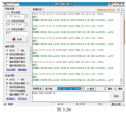 设备接线完成后,打开网络调试助手,工作模式选择TCPServer,选择相应的本地主机地址及主机端口,接受设置处选择用ASCII码显示,选择按日志模式显示,点击链接。当设备的SYS灯蓝绿色交替闪烁时,说明此时GPS功能连接成功,网络调试助手会有如图3.20一样的显示情况。绿色字符串为GPS的相关数据信息。