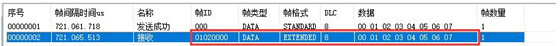 参数复位后,CAN端发送数据,接收到帧ID为01020000,帧格式为扩展帧,数据与发送数据相同,代表设备没有问题。