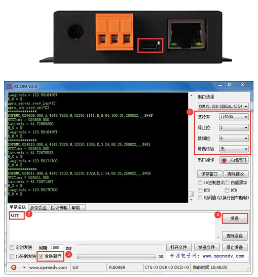 可通过本节查看设备正常使用过程中的问题日志,以此来获得解决方案:设备正常运行的前提下,使用USBmini线连接设备,打开串口调试软件,波特率选择“115200”,发送数据“ATPF”,勾选“发送新行”。