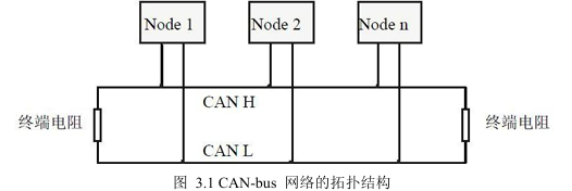 CAN-bus 网络采用直线拓扑结构,总线最远的 2 个终端需要安装 120Ω的终端电阻;如果节点数目大于 2,中间节点不需要安装 120Ω的终端电阻。对于分支连接,其长度不应超过 3 米。CAN-bus 总线的连接如图 3.1 所示
