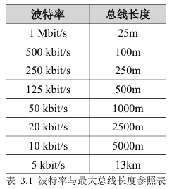 请注意:CAN-bus电缆可以使用普通双绞线、屏蔽双绞线。理论最大通信距离主要取决于总线波特率,最大总线长度和波特率关系详见表3.1。若通讯距离超过1km,应保证线的截面积大于Φ1.0mm2,具体规格应根据距离而定,常规是随距离的加长而适当加大。