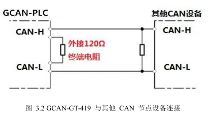 请注意:GCAN-GT-419的CAN总线内部未集成120Ω终端电阻。如果节点数目大于2,中间节点不需要安装120Ω的终端电阻。需要使用时,将电阻两端分 别接入CAN_H、CAN_L即可,如图3.2所示。