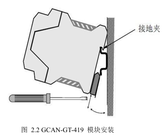 GCAN-GT-419 模块安装方法如图 2.2 所示,可使用一字螺丝刀辅助将模块安装到 DIN 导轨上。