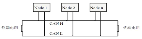 CAN-Bus 网络采用直线拓扑结构,总线最远的2个终端需要安装120Ω的终端电阻;如果节点数目大于2,中间节点不需要安装120Ω的终端电阻。对于分支连接,其长度不应超过3米。CAN-Bus 总线的连接见图3.1所示。