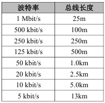 注意:CAN-Bus 电缆可以使用普通双绞线、屏蔽双绞线。理论最大通信距离主要取决于总线波特率,最大总线长度和波特率关系详见表3.1。若通讯距离超过1Km,应保证线的截面积大于Φ1.0mm2,具体规格应根据距离而定,常规是随距离的加长而适当加大。
