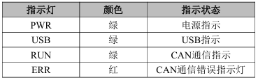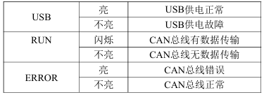 USB 接口及电源接口连接,打开供电开关,供电正常后,PWR指示灯会亮;当CAN端有数据传输时相应通道的RUN灯会亮;当CAN总线产生错误时ERR会亮。