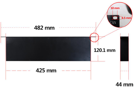 设备外形尺寸:(长)482mm * (宽)120.1mm * (高)44mm,其示意图如图2.1所示。