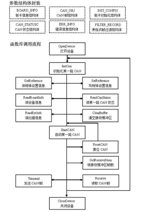 我公司为二次开发的用户提供标准的接口函数库,包括:ECANVCI.h、ECANVCI.lib、ECANVCI.dll。该接口函数库均为标准格式,用户可以在 VC、VB、Labview 等编程环境中,对这些接口函数声明调用,具体使用方法详见“EcanVCI 动态库使用手册”。图1为常用结构体名称及函数库调用流程。