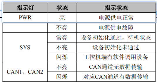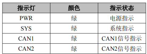 USBCAN-ME模块具有1个PWR指示灯、1个SYS指示灯、1个CAN1指示灯、1个CAN2指示灯来指示设备的运行状态。这4个指示灯的具体指示功能见表3.1,这4个指示灯处于各种状态下时,CAN总线的状态如表3.2所示。