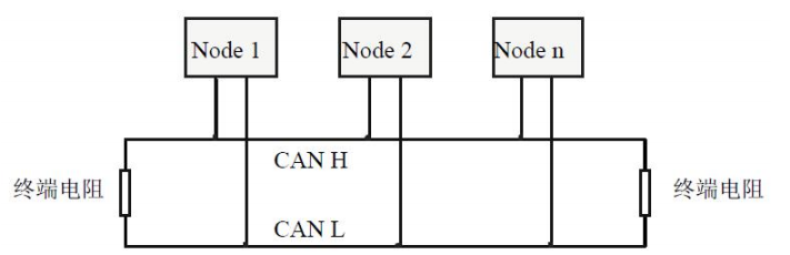 CAN-bus网络采用直线拓扑结构,总线最远的2个终端需要安装120Ω的终端电阻;如果节点数目大于2,中间节点不需要安装120Ω的终端电阻。对于分支连接,其长度不应超过3米。CAN-bus总线的连接如图3.1所示。