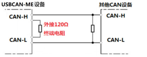 请注意:USBCAN-ME 模块内部默认未集成 120Ω终端电阻。如果节点数目大于 2,中间节点需要安装 120Ω的终端电阻。需要使用时,可以联系销售选装电阻,或将电阻两端分别接入 CAN_H、CAN_L 即可,如图 3.2 所示。