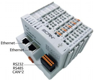 GCAN-PLC-420-J 总线通信接口由 2 个 RJ45 接口与端子接口组成。RJ45 接口包括 2 个以太网接口(出厂 IP 地址 192.168.1.30):