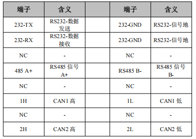 端子接口包括 1 个 RS232、1 个 RS485,2 个 CAN 总线接口,使用插拔式双排弹簧按压式端子引出。
