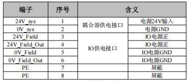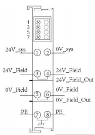 PLC 主控模块的电源接线端子排如图 2.8 所示。PLC 主控模块包含 8 个端子,各个端子对应的序号及其含义如表 2.2 所示。请注意,3 号端子与 4 号端子之间、5 号端子与 6 号端子之间、7 号端子与 8 号端子之间,在模块的内部是相连的。