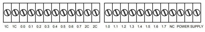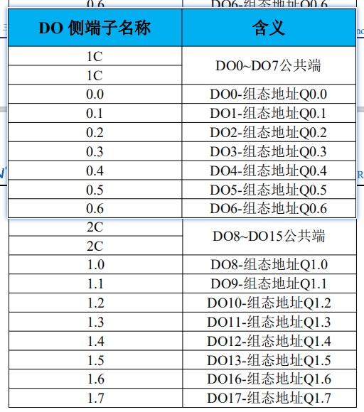 GCAN-PLC-326E/R 系列的主控模块含有上下两排端子排,上方端子排包含 DO 端子排,DO 端子排分别为 Q0.0~Q0.7,Q1.0~Q1.7 共 16 个数字量输出点, 其中 DO0、DO1 为 PNP 数字量输出及 PWM 高速脉冲输出复用接口,以及供电 接口,以及 4 个输出点公共端,其中两个 1C 为 Q0.0~Q0.7 的公共端,2 个 2C 为 Q1.0~Q1.7 的公共端,为防止发热过多固将每个公共端接出 2 个引脚,接口定 义如图所示。
