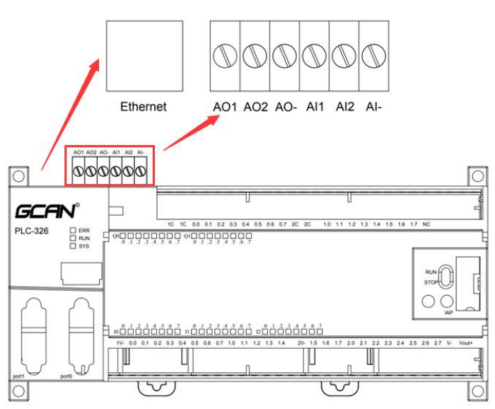 GCAN-PLC-326E/R 系列的主控模块含有一个以太网接口以及一组模拟量接 口接线端子排,如图所示。