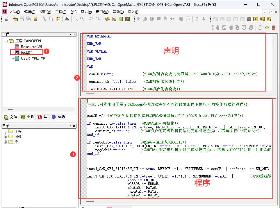 2. 点开test.ST,上半部分为程序声明,下半部分为具体程序。