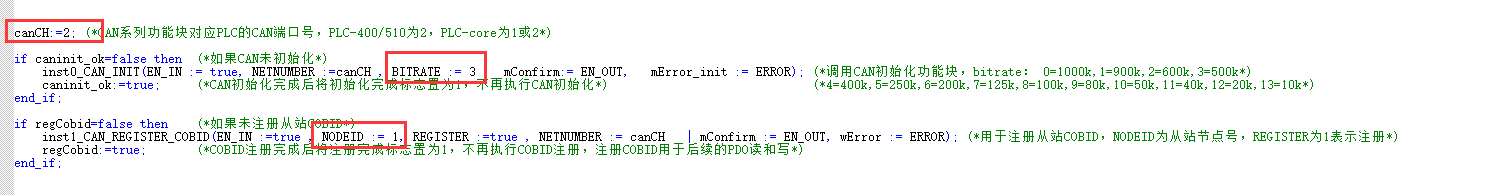 3.canCH为CAN的端口号,如下表;BITRATE为CAN通讯波特率:0=1M、1=预留、2=预留、3=500k、4=400k、5=250k、6=200k、7=125k、8=100k、9=80k、10=50k、11=40k、12=20k、13=10k;NODEID从站节点号;