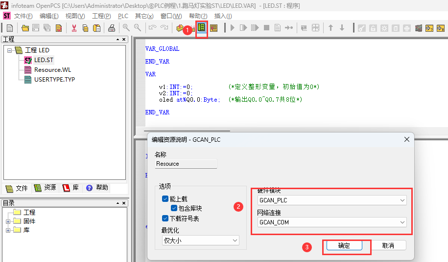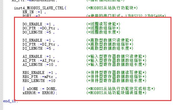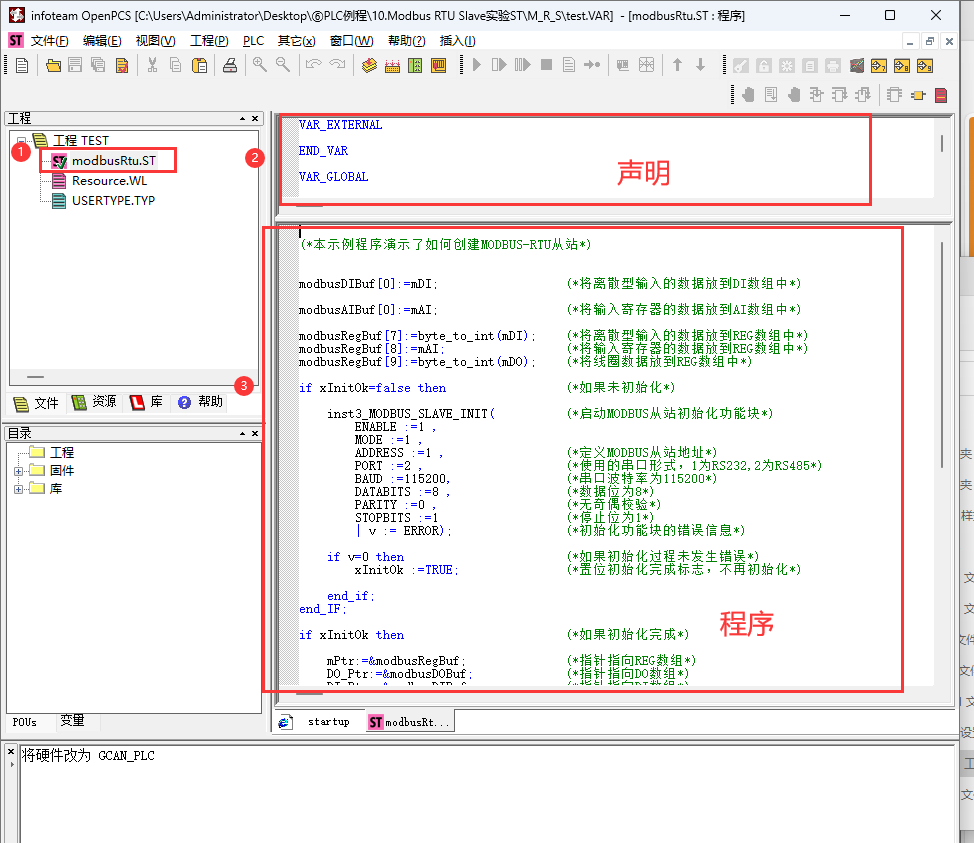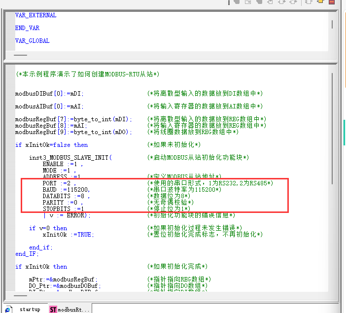 2.打开modbusRtu.ST,上半部分为程序声明,下半部分为具体程序。