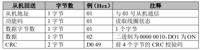 响应:响应信息中的各线圈的状态与数据区的每一位的值相对应,即每个 DO 占用一位(1 = ON, 0 = OFF)。数据区从高位到低位依次为 DO7、DO6......DO0。