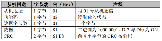 响应:响应信息中的各输入口的状态与数据区的每一位的值相对应,即每个 DI 占用一位(1 = ON, 0 = OFF)。数据区从高位到低位依次为 DI7、DI6......DI0。