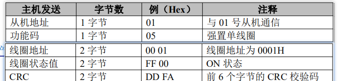 说明:强制单个线圈(DO,0X 类型)为 ON 或 OFF 状态,广播时,该功能可 强制所有从机中同一类型的线圈均为 ON 或 OFF 状态。