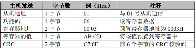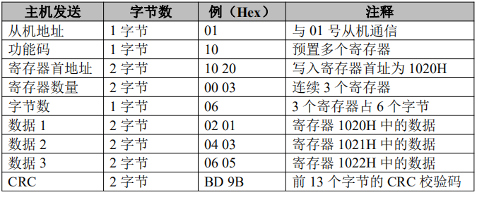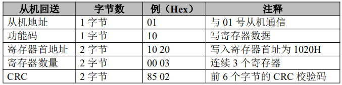 响应:正常响应返回从机地址、功能代码、起始地址和预置寄存器数。