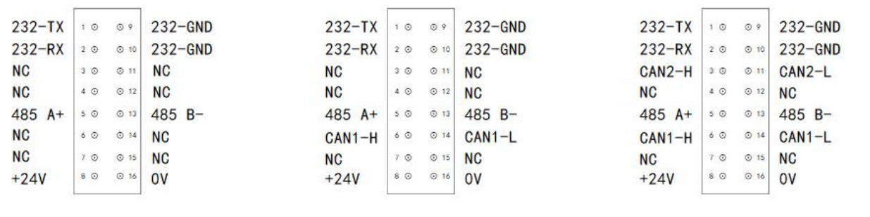 下图从左至右依次为GCA-PLC-320、321、322的串口通讯接口示意图_使用插拔式双排弹簧按压式端子引出。【GCAN-PLC-320/321/322用户使用手册_中文版】