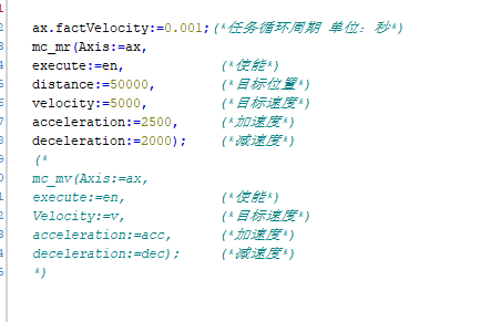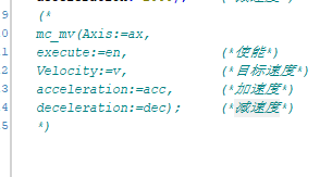 mc_mv为走速度模式的功能块,Velocity为目标速度,acceleration为加速度,deceleration减速度