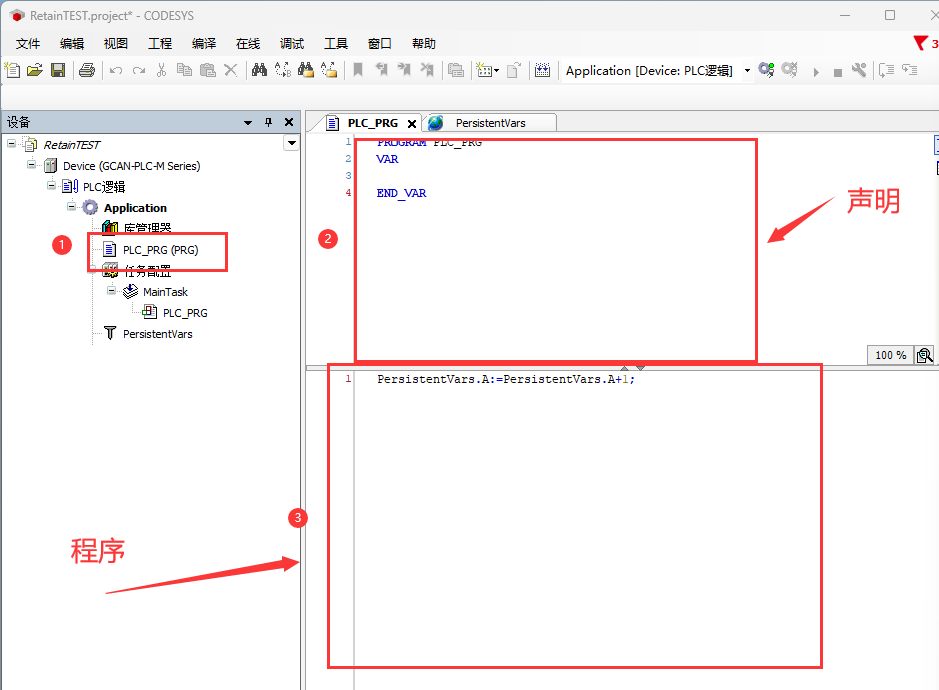 3.打开PLC_PRG(PRG),上半部分为声明,下半部分为程序