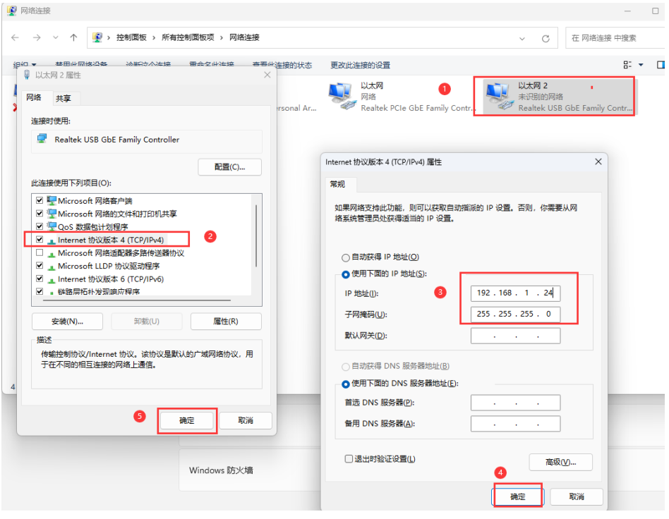 7.将设备与电脑连接的网口的IPV4改成192.168.1.24