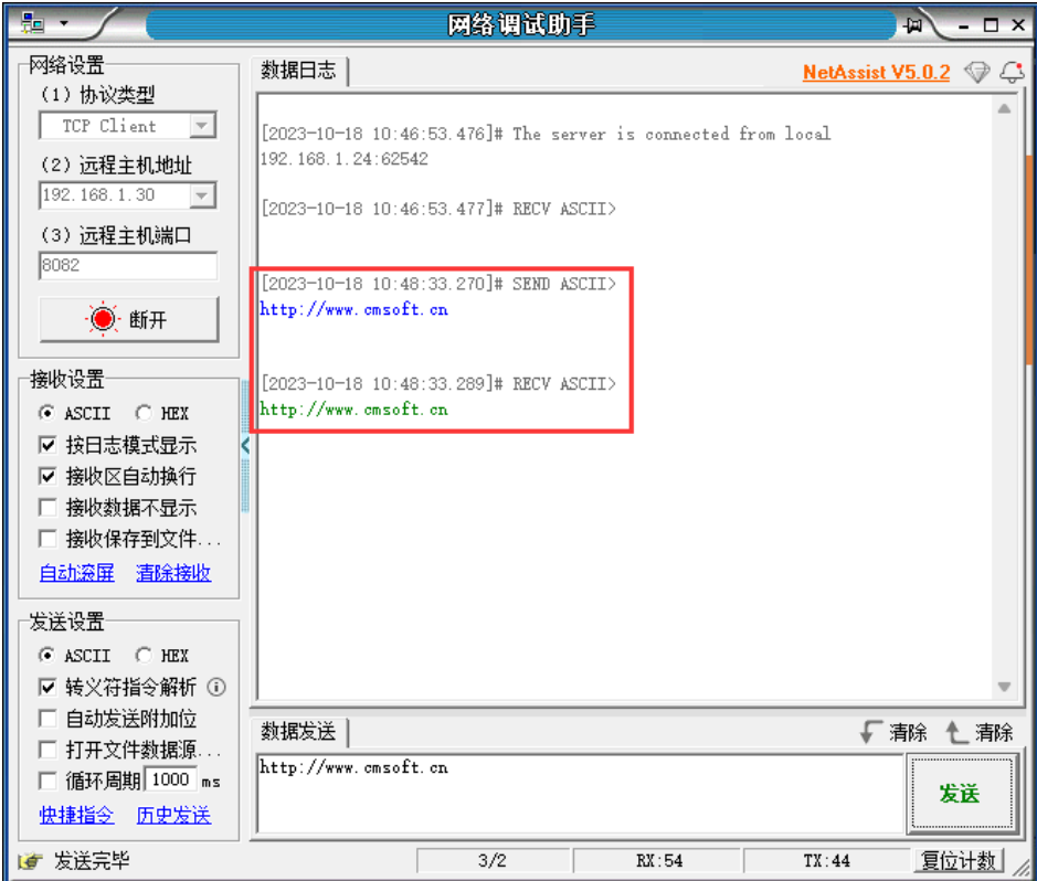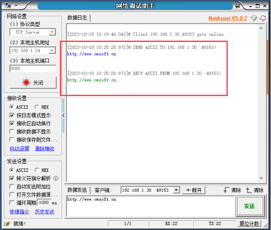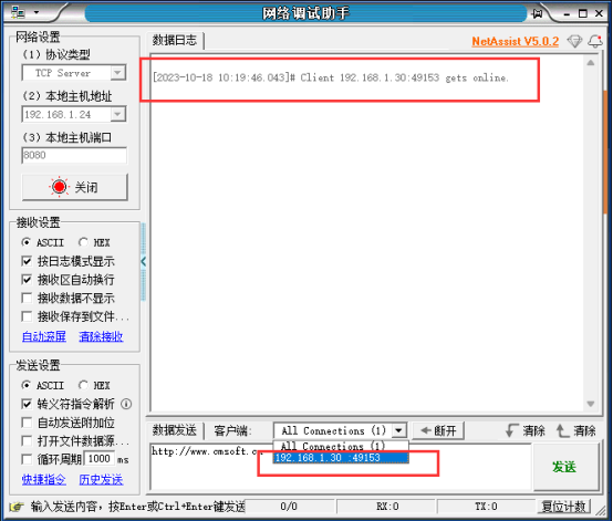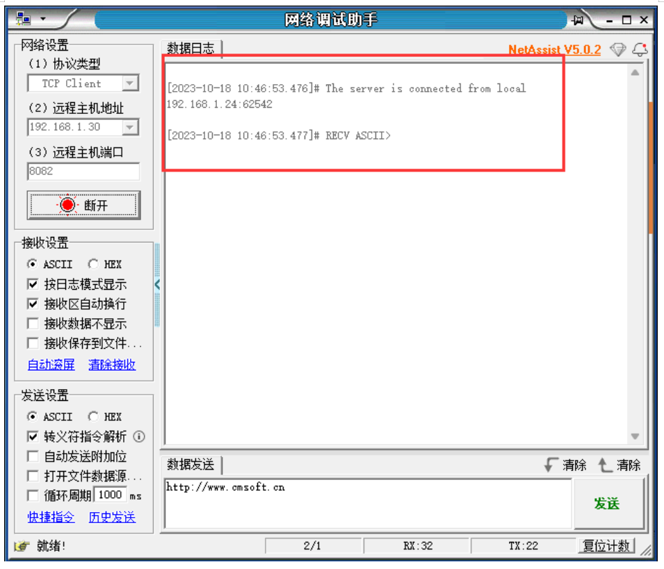 1.打开网络调试助手(以我们提供的软件为例,下载:4.网络调试助手NetAssist),→协议类型选择:TCP Client→远程主机地址:192.168.1.30→远程主机端口号:8082→连接