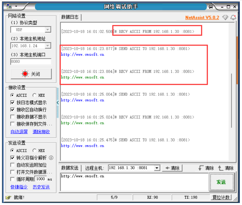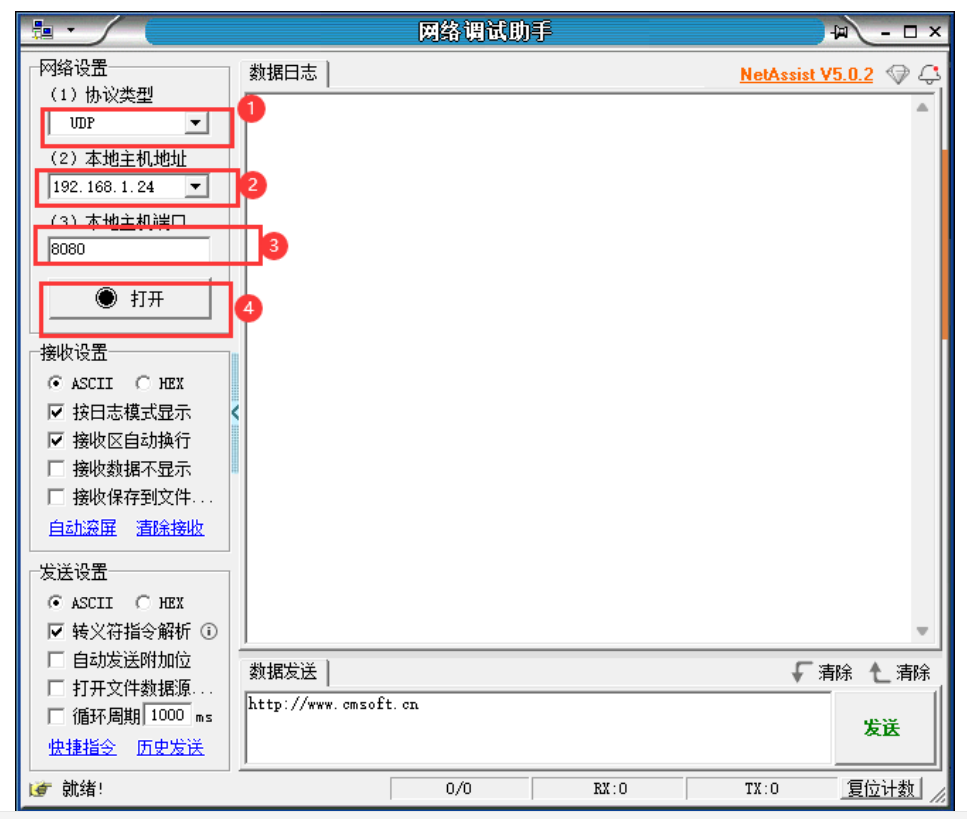 (以我们提供的软件为例,下载:4.网络调试助手NetAssist)  →协议类型选择:UDP→本地主机地址:192.168.1.24→远程主机端口号:8080→打开