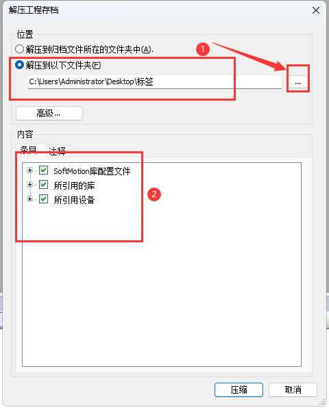 如出现如图1.0的弹窗:“解压到以下文件夹”→通过“...”选择解压程序所在位置→勾选②框内的所有复选框→点击确定