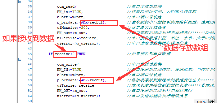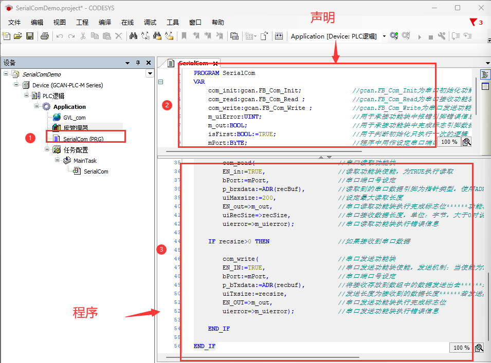 2. 点开SerialCom (PRG),上半部分为程序声明,下半部分为具体程序。