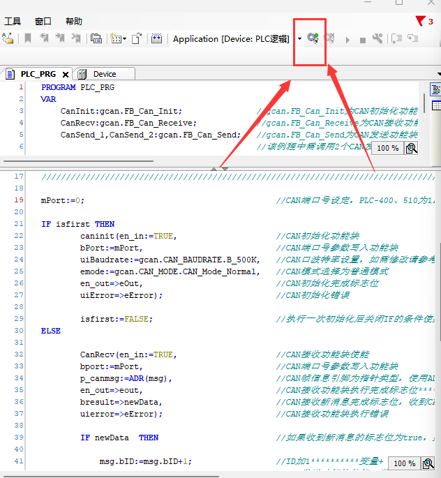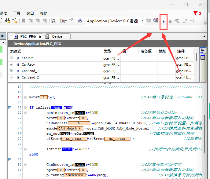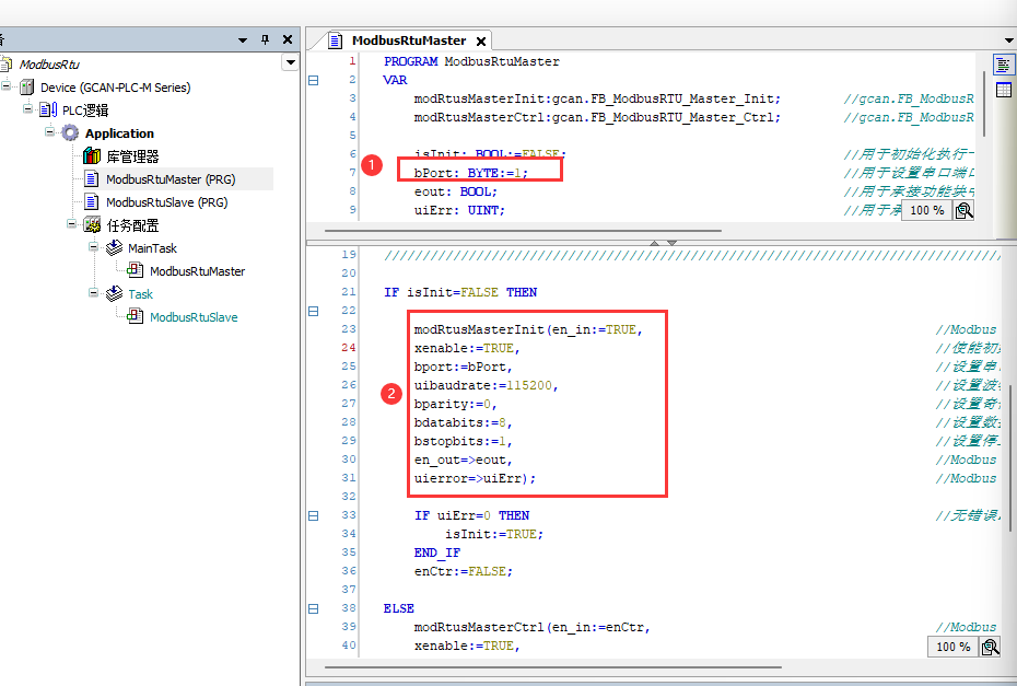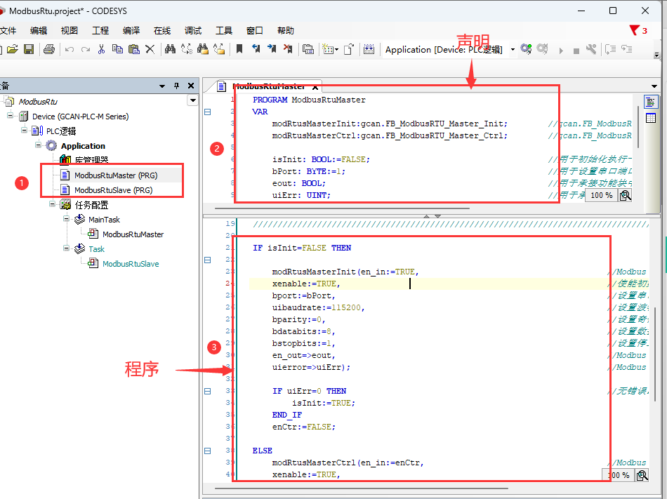 2.打开ModbusRtuMaster_(PRG)或ModbusRtuSlave (PRG),上半部分为程序声明,下半部分为具体程序。