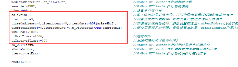 bslaveid为要访问的从站节点号;bfunction为主站要用的功能码;uireadaddress为要读数据的起始寄存器地址;uireadcount为要读寄存器数量;p_readdata为读取数据存放的数组;uiwriteaddress要写数据的起始寄存器地址;uiwritecount为要写寄存器数量;p_writedata为写数据存放的数组;uiOverTimes为超时时间;uiIntervalTimes为发送间隔时间(轮询时间)。
