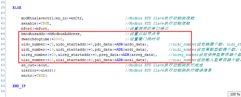 bmodbusaddr为设置从站节点号;uido_number、uido_startaddr、pdo_data分别为设定线圈个数、设定线圈起始地址、数据存放在ardo_data数组;uidi_number、uidi_startaddr、pdi_data分别为设定离散型数据个数、离散型数据起始地址、数据存放在ardi_data数组;uireg_number、uireg_startaddr、preg_data分别为设定保持型寄存器个数、 保持型寄存器起始地址、数据存放在arreg_data数组;uiai_number、uiai_startaddr、pai_data分别为设定输入型寄存器个数、输入型寄存器起始地址、数据存放在arai_data数组;