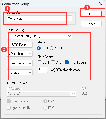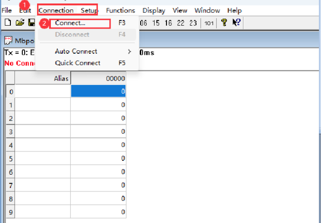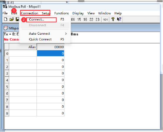 8.打开Modbus Poll→Connection→Connect...