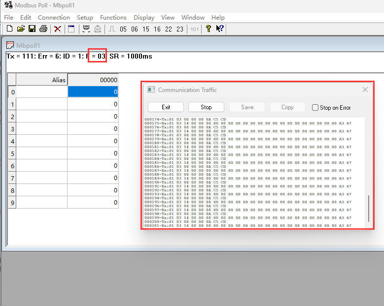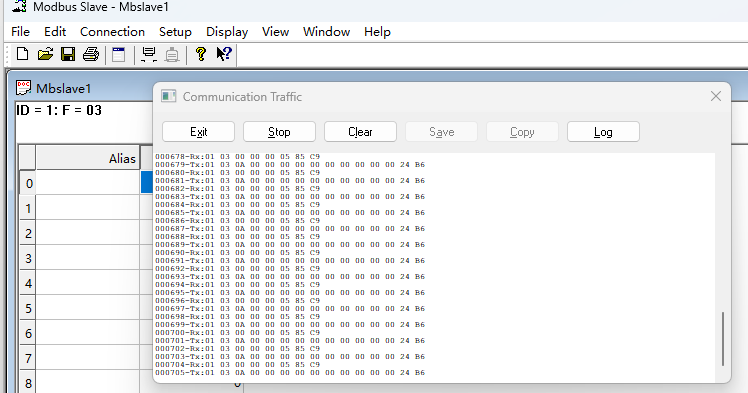 3.主站就会执行程序中所填写的对应功能码(图1),通过Modbus Slave(通过Modbus Slave看底层交互数据:Display→communication...)_图2