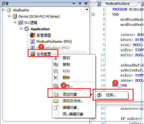 3.添加从站任务:任务配置→添加对象→任务...
