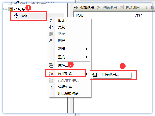 5.添加程序调用:Task右键→添加对象→程序调用...