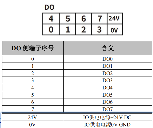 GCAN-PLC-221 的主控模块右侧顶板含有上下四排端子排,下方两排端子排的右侧为 DO 端子排,分别为 DO0~DO7 共 8 个数字量输出点,以及 1 组 IO 供电电源接口(IO 供电电源已与系统电源隔离,IO 模块需供电后才能正常工作),如图所示。各个端子对应的序号及其含义如表 2.4 所示。