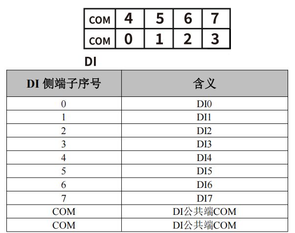 上方两排端子的左侧为 DI 端子排,分别为 DI0~DI7 共 8 个数字量输入点,以及 2 个 DI 的 COM 接口(2 个 COM 口内部已短接,任意连接 1 个即可),如图所示。各个端子对应的序号及其含义如表 2.5 所示。