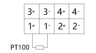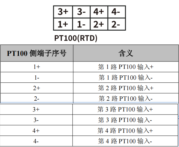 上方两排端子排的右侧为 PT100 端子排,分别为 R1~到 R4±四路 PT100 输入,如图所示。端子对应的序号及其含义如表 2.7 所示。