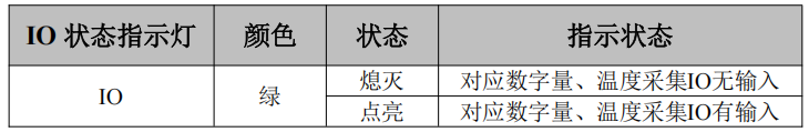 IO 指示灯用来指示设备数字量 IO、PT100 温度采集的运行状态(模拟量 AI无指示灯)。