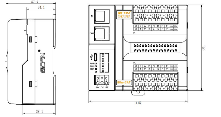GCAN-5032 外观如图 2.1 所示,(长)115mm * (宽)100mm * (高)58mm。设备包含 2 个 EtherCAT 通信接口,一个 USB-Type C 接口,1 个电源接口,2 组 I/O电源接口(电源内部已短接),4 个 DI 的 COM 接口。USB 接口可用来升级固件。
