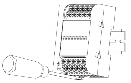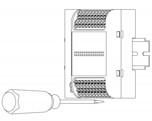 先将模块下方的导轨卡扣用一字螺丝刀拉出;然后将模块挂到 DIN35 导轨上,并使用一字螺丝刀将下方的导轨卡扣推进去锁定,如图所示: