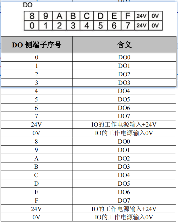 GCAN-5032 EtherCAT 远程 IO 模块的主控模块含有上下四排端子排,下方两排端子排为 DO 端子排,分别为 DO0~DO7,DO8~DOF 共 16 个数字量输出点,以及 2 组 IO 电源输入(请任选 1 组 IO 工作电源接口接入 24V 即可,注意同时需要接入系统电源,系统电源详见表 2.1,IO 工作电源与系统电源彼此隔离),如图所示。各个端子对应的序号及其含义如表 2.2 所示。
