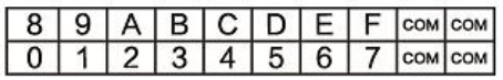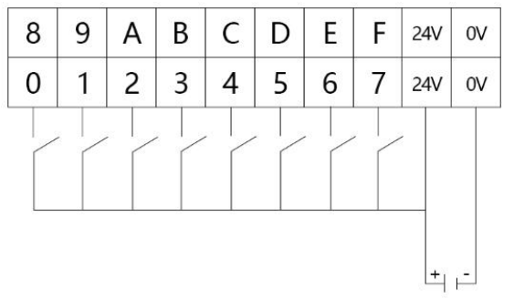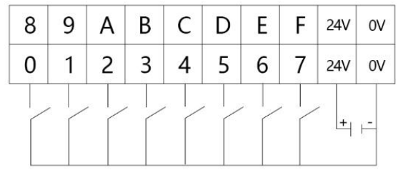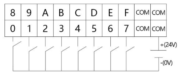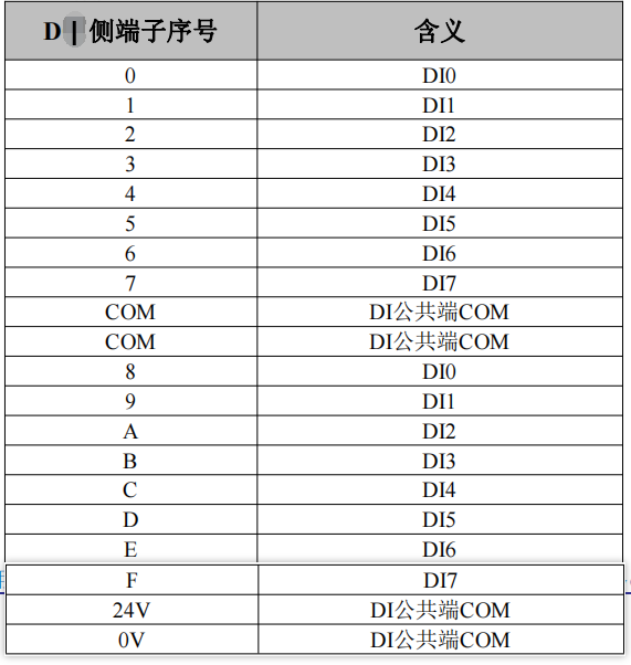 上方两排端子为 DI 端子排,分别为 DI0~DI7,DI8~DIF 共 16 个数字量输入点,以及 4 个 DI 的 COM 接口(4 个 COM 口任意连接 1 个即可),如图所示。各个端子对应的序号及其含义如表 2.3 所示。